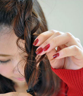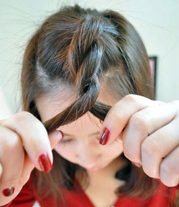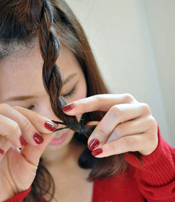 把綁好的劉海分成均等兩束,纏繞扭轉(zhuǎn)至發(fā)尾。