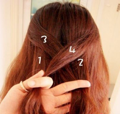 在后腦勺上方勾起部分頭發(fā),分成四股。