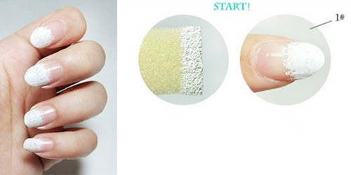 步驟一:在上甲油前記得要先上層底油,這樣能保護(hù)指甲。用海綿蘸取白色加油,按在指甲1/2處。