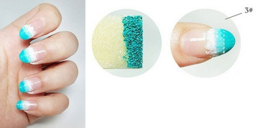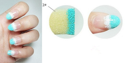 步驟二:蘸取粉藍(lán)色甲油蓋在白色甲油的2/3,做漸變。