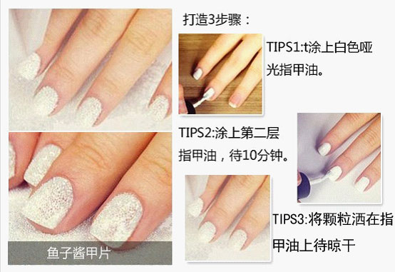 STEP1 :先為指甲上一層清透的底油。然后,再涂上準(zhǔn)備好的白色啞光指甲油以輕薄為主等待它完全晾干。我們選擇的是白色,當(dāng)然你也也可以選擇一款與閃亮微粒相搭的顏色。