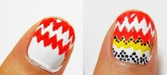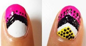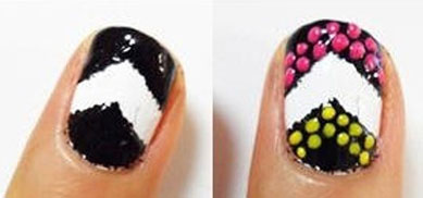Step2:首先在拇指進行彩繪。用一把細細的刷子或是毛筆,在白色的底油上描畫鋸齒圖案,再均勻的點上黑色的甲油。并且沿著鋸齒的邊緣均勻畫上小黑點。