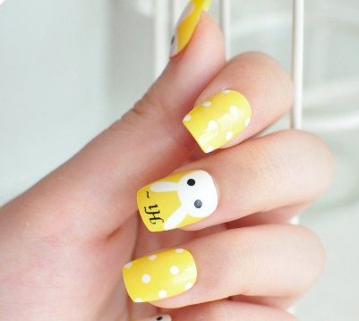 以亮麗的糖果黃為底色,繪上均勻的白色波點,極為俏皮可愛。然后用白色的指甲油在指甲底部繪上一個橢圓作為兔子的臉蛋,再在上面描上兩只長長的耳朵。用黑色指甲油點出兔子的雙眼,在指甲頂部加上“Hi”,萌感十足。