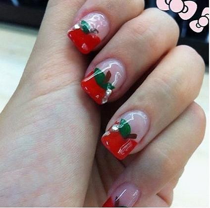 2012美甲圖案精選,用水果妝點指甲。爽脆的紅蘋果誰不喜愛,而且常吃蘋果還有益健康。光吃不夠還要看,所以就把蘋果畫到了指甲上了。先畫上一層瑩亮的粉色指甲油作為底色,待它干透后開始把蘋果畫上去了。蘸取紅色的指甲油在指甲的中部開始畫出紅色的法式美甲款,同樣是要等待顏色干透;接下來就可以用綠色的指甲油添上蘋果的葉子了,無論是一片還是兩片都可以,只要你喜歡就好。最后就是要畫“!绷,輕輕地在葉子根部添上小小的一筆,蘋果就已經(jīng)畫好了。覺得蘋果不夠閃亮?小編也有辦法,就是使用透明的水鉆,偽裝成水滴的樣子吧。挑選適合大小的水轉,把它粘到蘋果的一側就可以了。上述的美甲彩繪,親愛的姐妹們已經(jīng)學會了嗎?