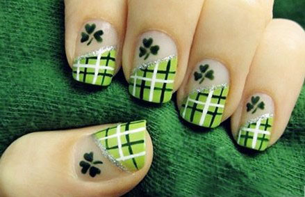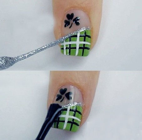 綠格子DIY美甲教程step4:用銀色指甲油裝飾下這一造型。在三葉草和網(wǎng)格分界的地方畫上一條斜邊。最后等甲油都干透后,刷上一層護甲油,這款小清新的美甲就完成啦。