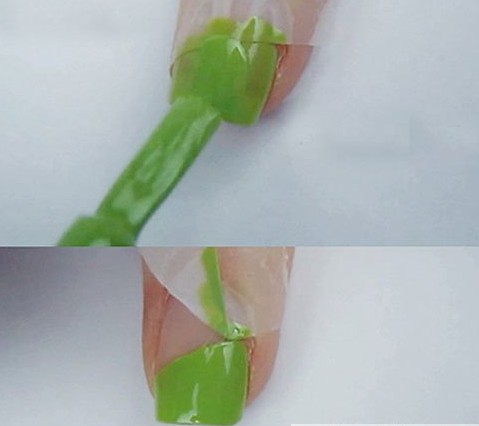 綠格子DIY美甲教程step1:為了更好地達到造型的效果,在圖指甲油前先用膠帶覆蓋半個甲片,然后用綠色甲油涂抹尖端那一半的甲片,兩層就夠了。等甲油干后,膠帶就可以撕下來。