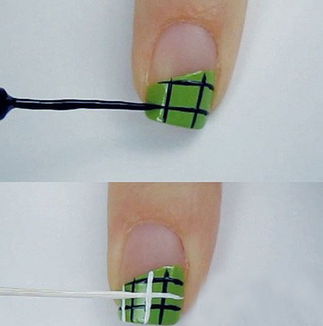 綠格子DIY美甲教程step2:綠色甲油干后,用墨綠色的甲油在上面刷出“井”字,讓它呈現(xiàn)網(wǎng)格的形狀。然后用白色甲油在“井”字上加上一橫兩豎。