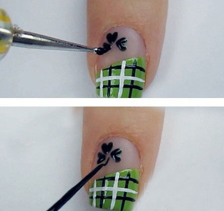 綠格子DIY美甲教程step3:網(wǎng)格添加完后,便開始三葉草的點綴。用點鉆筆畫出三個小愛心就OK了。是不是很簡單。最后在下方刷出一撇作為三葉草的莖部。