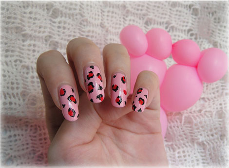 利用淺粉紅與紅色畫豹紋,跟四指的粉紅頑皮豹PK裝可愛。可以試試各種色系,只要選擇同色系一深一淺再用黑色框邊都行得通。淺色盡量找?guī)Х鄣纳{(diào)才不會過于強烈。
