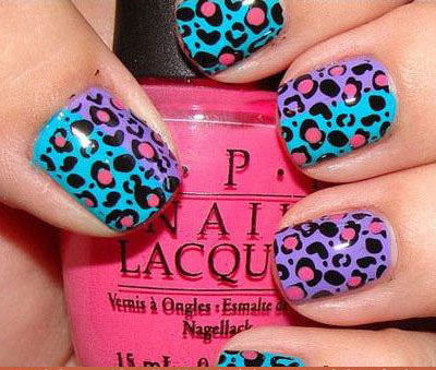 選擇豹紋美甲顏色的時(shí)候,不妨往完全相反意想不到的色彩思考,紫色與天藍(lán)色的底色讓豹紋圖案更加性感誘人。