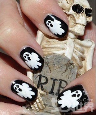 鬼馬幽靈,這種圖案讓人想起了只有白色的被單在那里飄蕩,可是里面卻是空空的,沒錯,這就是恐怖的幽靈,黑色甲油打底,白色的幽靈向你飄來,長著恐怖的大嘴,一步一步。