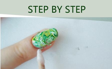 然后用白色指甲油,明黃色指甲油,綠色指甲油隨意在甲面上點(diǎn)上幾點(diǎn)。
