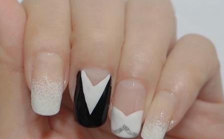 等白色指甲油干后,用黑色指甲油在中指畫(huà)出一個(gè)V字型并涂滿(mǎn),是不是很像燕尾服呢?接著用銀色指甲油在無(wú)名指靠近指尖處畫(huà)出一個(gè)倒V并填滿(mǎn),新娘的禮服也初步完成了。