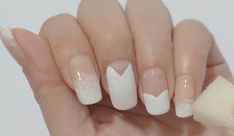 底油干后接下來(lái)就可以進(jìn)行美甲彩繪部分了。首先用白色指甲油涂抹中指和無(wú)名指,中指底部留出一個(gè)三角形,無(wú)名指則從中間部分畫(huà)出一個(gè)有弧度的V型,之后將上半部分的指甲涂滿(mǎn)。將化妝海綿上涂抹白色指甲油,之后輕輕擦拭其余手指的指尖,塑造出漸變感。