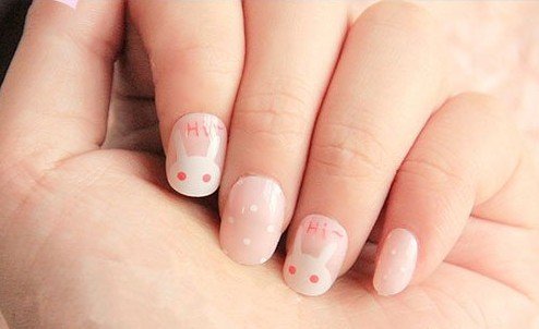 好可愛好萌的圖案,黃小雞和白小兔!非常適合上學的MM哦!這款很講究美甲師的畫工,稍微畫歪了就不可愛了哦!