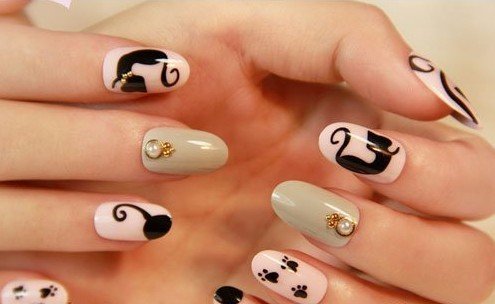 古靈精怪的小黑貓圓頭美甲圖案,嫩粉和大象灰搭配的假指甲,賣萌系,上手超級可愛,顯手白,很萌很特別。顏色搭配的更是完美哦。