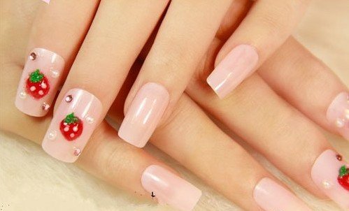 是不是很可愛呢?顏色超級粉哦,上手特別好看,超級顯手白。指甲上的草莓特別的Q,很萌的感覺。還有小水鉆。讓整個指甲看起來很飽滿,蘿莉們還等什么呢?