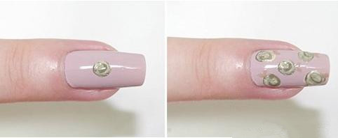 下面要進(jìn)行美甲彩繪的部分了。蘸取卡其綠色指甲油,在灰紫色甲面上點(diǎn)出一點(diǎn),不必畫得太圓,隨意就好;趁指甲油還沒干透再用米黃色指甲油點(diǎn)出一個(gè)稍小的圓點(diǎn)疊加其上。