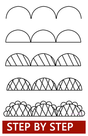用最直觀的教程告訴大家,蕾絲花邊應該怎么畫。首先畫三個半圓后畫上菱形格子再加上小半圓花邊就可以了。非常簡單!