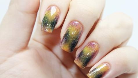 萬(wàn)圣節(jié)的主色調(diào)就是紫色和橙色,因此用紫色、橙色、黃色以及少量黑色指甲油在化妝海綿上隨意點(diǎn)涂。