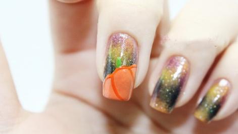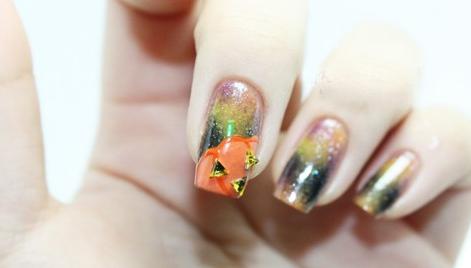 用細(xì)筆蘸取橙色指甲油描畫(huà)出南瓜的邊緣線,南瓜柄則用綠色指甲油。