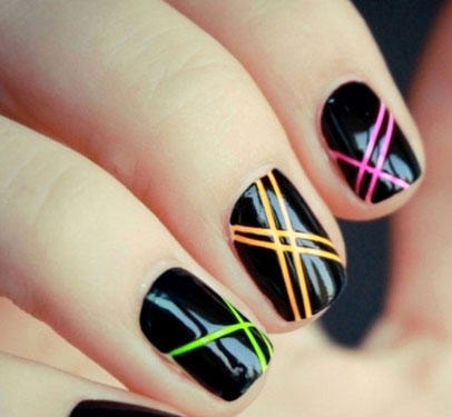 黑色指甲油作為底色,畫(huà)上不規(guī)則分布的不同顏色的線條,簡(jiǎn)單點(diǎn)綴就很不一樣,時(shí)尚又不會(huì)失大體。