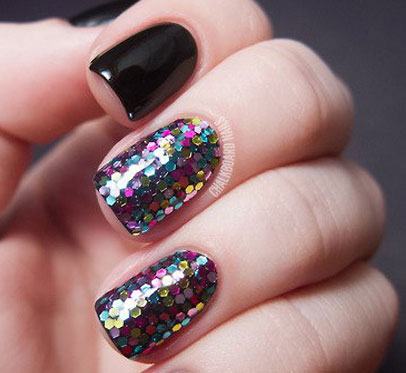 同樣是黑色美甲,但是個(gè)別指甲選擇不同的指甲油就會(huì)很不一樣,比如像這個(gè)一樣中指和無(wú)名指選用彩色亮片的指甲油涂抹。整個(gè)美甲顯得與眾不同許多。