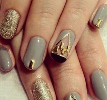 灰色底色的指甲油不會(huì)像黑色那么強(qiáng)硬,點(diǎn)綴上特別的各種圖案和亮片,無(wú)名指用金色閃閃指甲油,幾何三角形的圖案增加時(shí)尚度,是一款很大牌感的美甲。