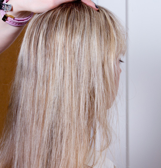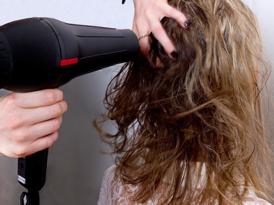 step1:打造這款發(fā)髻頭發(fā)需要有足夠紋理,太順滑的直發(fā)會增加難度,而頭發(fā)太卷曲做出來效果會很混亂,所以在直發(fā)基礎(chǔ)上增加蓬松度就可以了。在發(fā)根抹上一些噴霧摩絲增加豐盈度,然后用吹風(fēng)機(jī)吹干。如果你的頭發(fā)比較細(xì)軟,就多用一些摩絲,不要擔(dān)心用太多,它們會讓這款發(fā)型更容易實(shí)現(xiàn)。