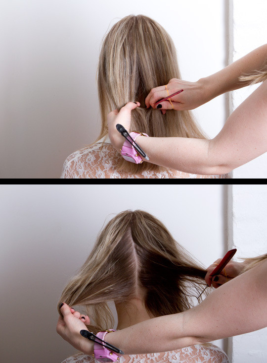 step2:從額頭開始往后一直到后頸窩,用尖尾梳把頭發(fā)一分為二。