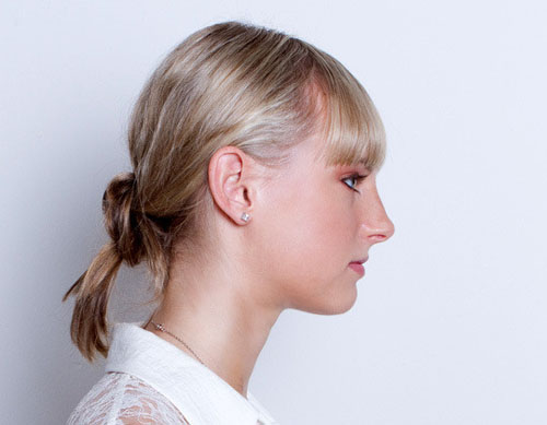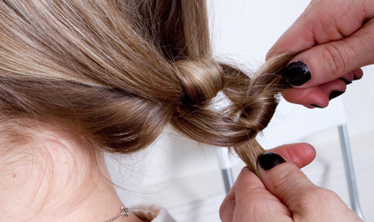 step4:像平時綁鞋帶一樣,把兩股頭發(fā)打一個單結(jié),并拉緊。