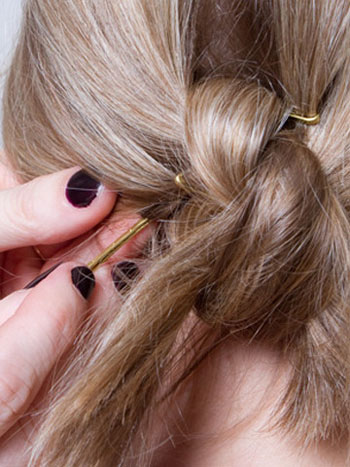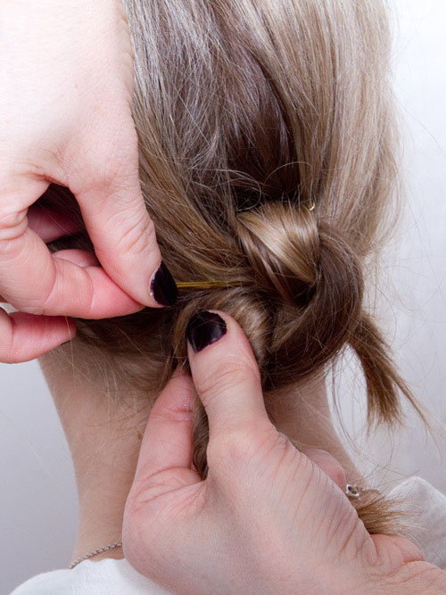 step8:再用發(fā)卡固定第二個發(fā)結(jié),你還需要第3個發(fā)卡穿過兩個發(fā)結(jié)之間固定。