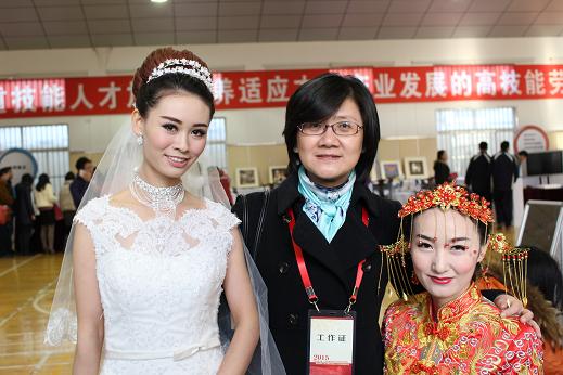 新東坊楊浦分校--同濟科技進修學(xué)院也受邀,擔(dān)任“新娘妝”板塊的作品展示任務(wù),由我校的鄭劍老師(歐式浪漫白紗新娘),邱蕾老師(龍鳳呈祥中式新娘)制作完成。