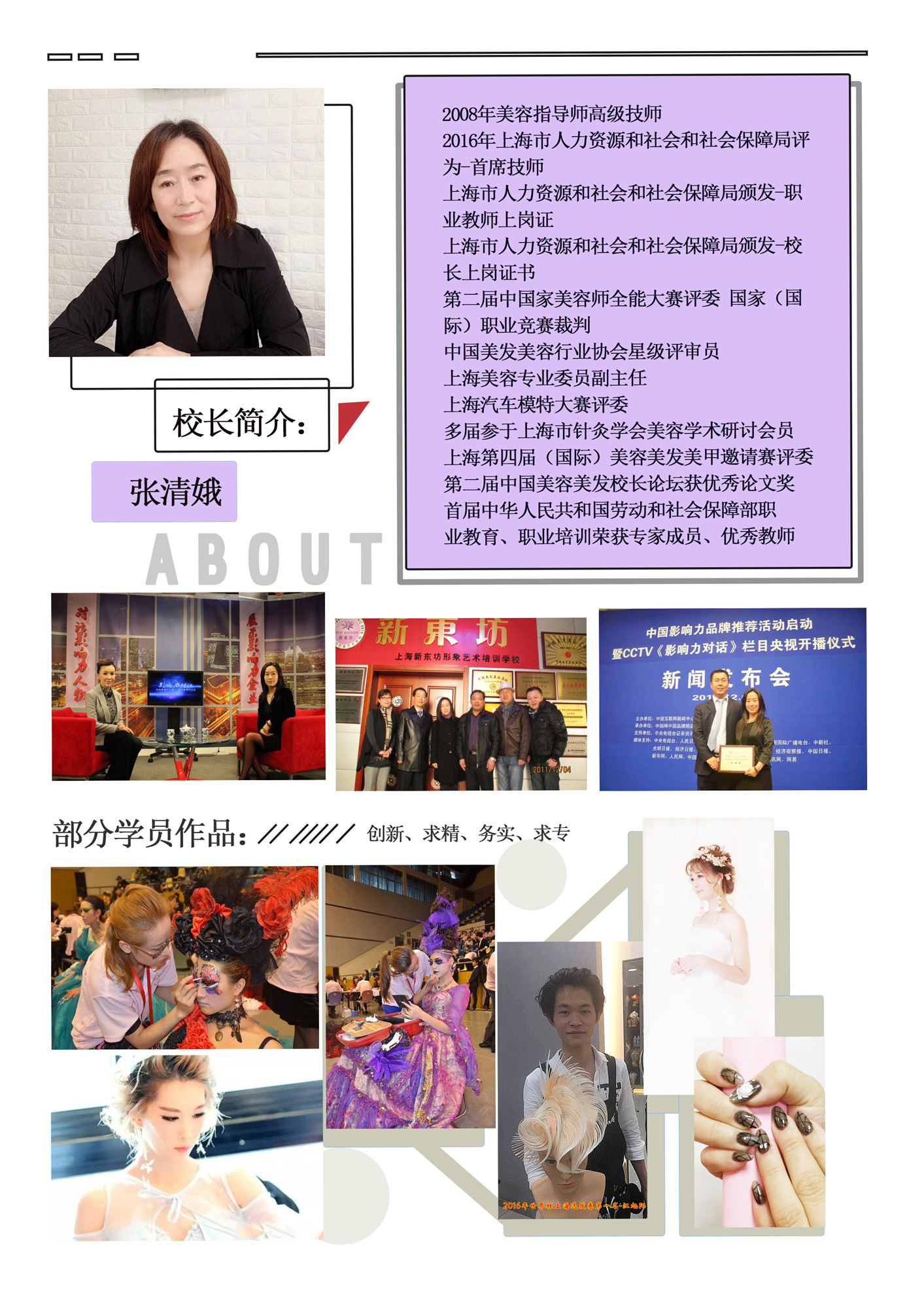 新東坊學(xué)校2012-2018年上海市人力資源和社會(huì)保障局評(píng)為“誠(chéng)信等級(jí)A級(jí)單位”;2008至今年上海市職業(yè)技能競(jìng)賽委員會(huì)授權(quán)“競(jìng)賽承辦單位”;年度評(píng)為“優(yōu)秀辦學(xué)單位”; 2013至今年度“優(yōu)秀示范辦學(xué)單位”;2013-2018年度世界杯一類美發(fā)師競(jìng)賽個(gè)人一,二,三等獎(jiǎng)、團(tuán)隊(duì)一,二等。
