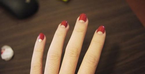 將第二種顏色涂抹在指甲上,顏色可以自由選擇。如果底色是深色的話,表面顏色就需要選擇遮蓋力好且高飽和度的色彩,且涂抹兩遍,才能完全覆蓋底色。不過(guò)如果你玩的就是兩種顏色的混搭,那就隨便嘍。比如編輯選的金色為底色,如果表面的紅色只涂抹一層的話,能看見(jiàn)金屬的光澤透出;如果涂抹兩遍紅色,就是純正的漆光大紅色。