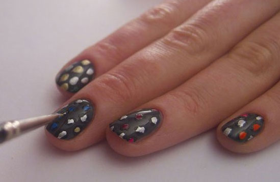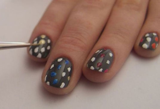 你需要準(zhǔn)備:快干噴霧、彩繪筆、底油、暗灰色、白色、黑色、銀色以及多種顏色的甲油、亮油