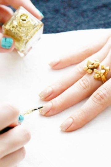 第5步:再涂過兩層裸色甲油后,讓你的指甲完全晾干。“你需要在完全干了的指甲上做其余的工作,因為如果你涂上的甲油還沒干,你會在涂上亮片甲油時留下毛刷的痕跡!