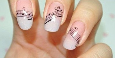 步驟五:把樂譜貼紙貼上之后,用剪刀把多出指甲的部分剪掉,全部貼好后在指甲上涂上一層透明的光油,這個(gè)樂譜美甲的大功告成了。