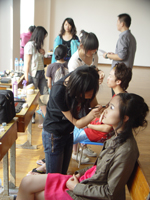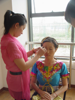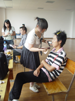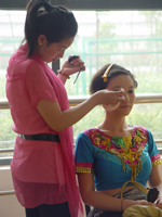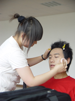學(xué)生為晚會的演員主持人做化妝造型現(xiàn)場