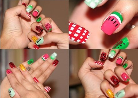 首先為大家送上的是這款可愛(ài)的美甲,它是由眾多的具有夏日元素的圖案組成的,有西瓜,草莓,瓢蟲(chóng)等等。每一個(gè)圖案都有著極其鮮艷的色彩,各類(lèi)元素集中在指尖上顯得非常的和諧和熱鬧。如此一款艷麗奪目,可愛(ài)自然的美甲圖案,你喜歡嗎?