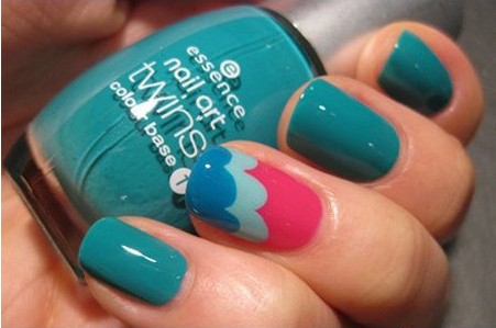 屬于夏日的色彩,我們又怎么可以少了湖水綠色的指甲顏色呢。大片的湖水綠色甲油均勻地涂抹在每個(gè)指尖,讓人感受到絲絲的清涼。選取其中一個(gè)指甲做些小裝飾,畫(huà)上了桃紅色,薄荷綠色和天藍(lán)色組成的波浪圖案,如海水般充滿(mǎn)動(dòng)感。