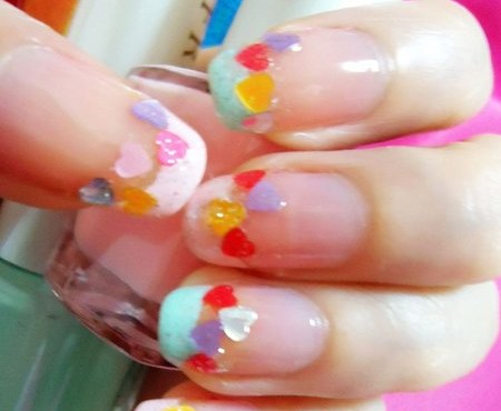 最后要為大家介紹的可愛(ài)美甲是這樣一款。薄荷綠色和粉紅色打造的法式指甲。先涂上一層透明的指甲油,然后在指尖的位置畫(huà)上薄荷綠色和淡粉紅色的甲油,接著是把顏色各異的小小心形閃片,讓指甲看上去更加的繽紛可愛(ài)。(本文由上;瘖y培訓(xùn)學(xué)校整理辯解)